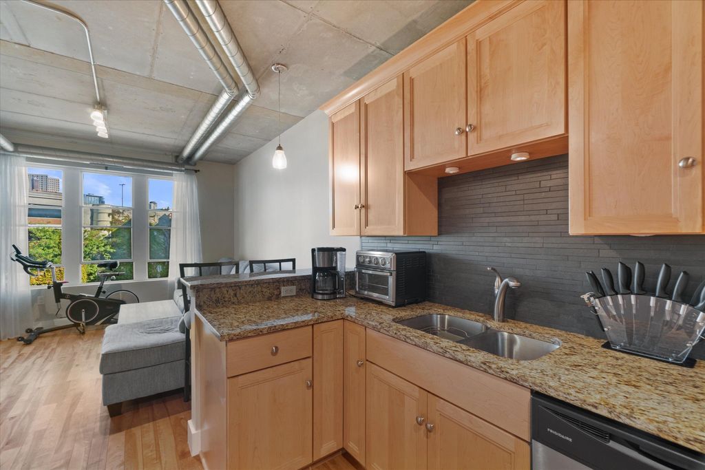 Check out this spacious 1 bedroom plus den in the historic Third Ward district of Milwaukee. So much to do right at your fingertips....shopping, dining and just relaxing and enjoying the river. Open floor plan featuring industrial concrete ceilings & exposed ductwork, ceiling fans, great views of Water Street. Updated kitchen with breakfast bar, loads of cabinets, granite countertops, SS appliances & tile backsplash. Beautiful and large bathroom with great tile work. Spacious bedroom with large closet. Den is perfect for home office or additional living space. In-unit laundry. Beautiful 2nd floor common courtyard overlooking the river. Two pets allowed! Condo fee includes: heat, air, water, cable, internet.