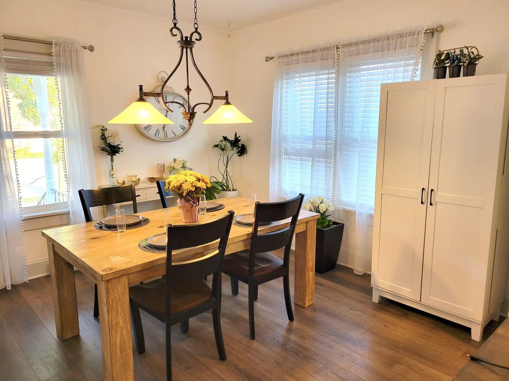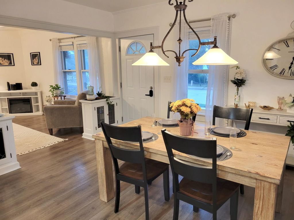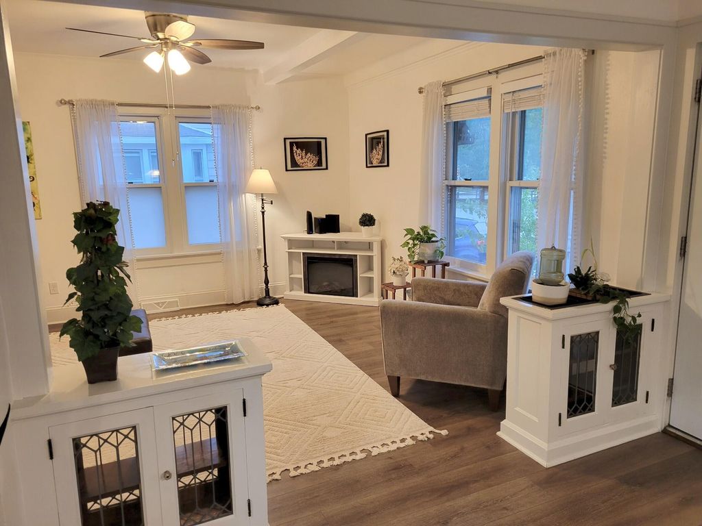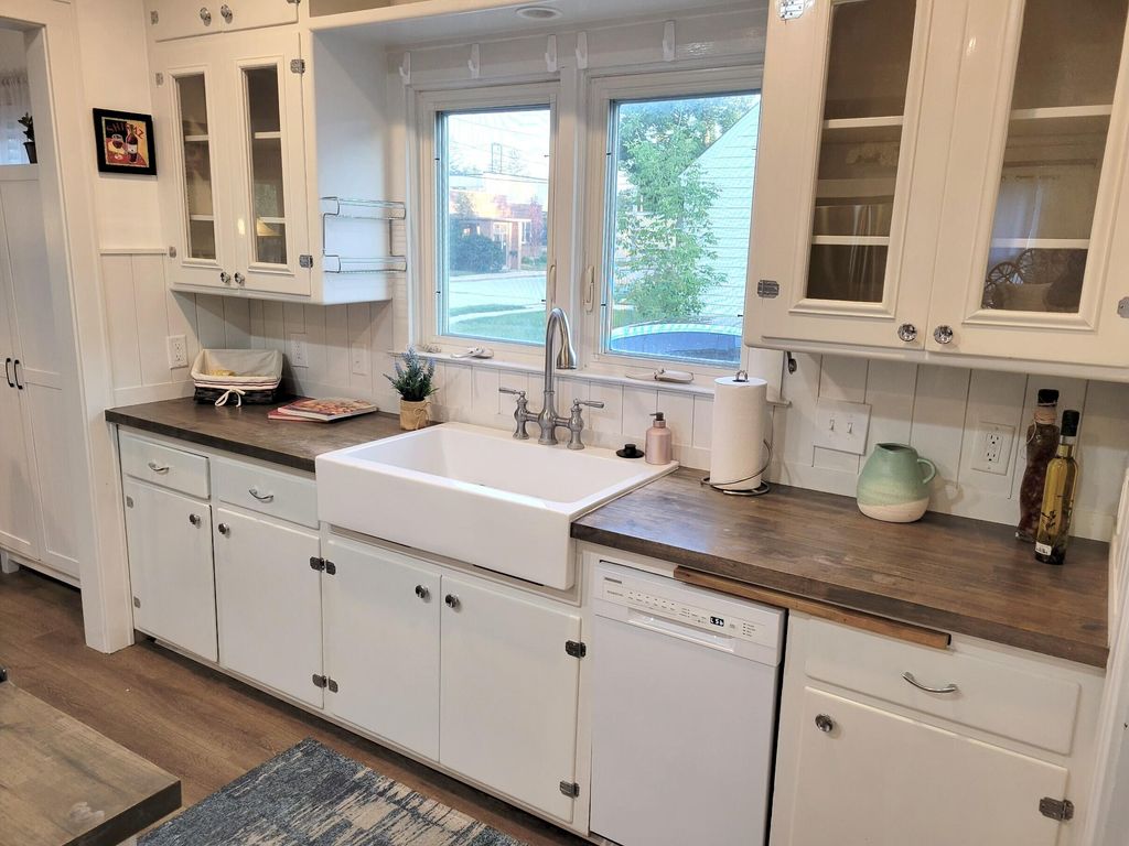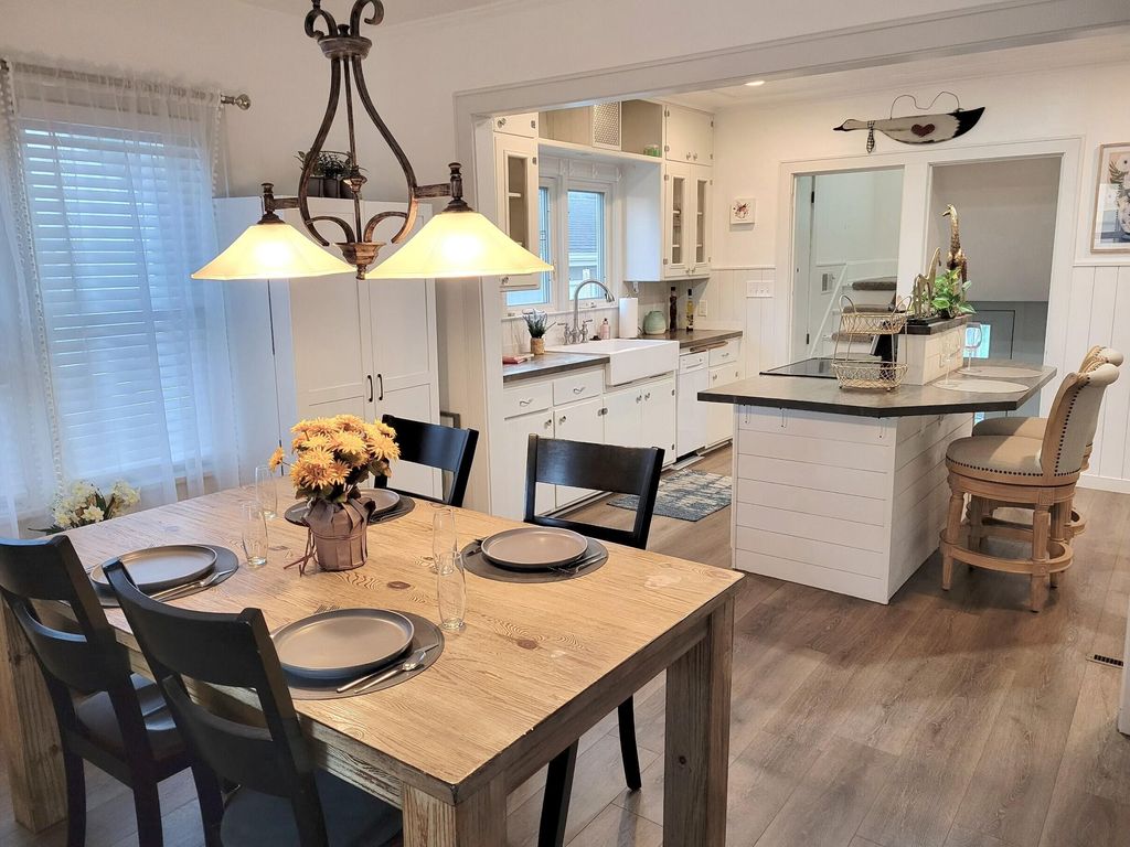 Cute, open and bright with open concepted and some old world charm . Main floor Front room, dining room and open kitchen with breakfast bar. Master bedroom and full bath,. Leaded glass cabinets in front room. Plenty of storage. 2nd floor with open area, 2 bedrooms and large full bath. All rooms have large closets. Lower level has rustic bar/rathskeller and game room. Bar has old time coolers. Screened in, very private, back porch and fenced in back yard. Patio with pergola. 1.5 car garage and extra parking. Great location, walk to veteran park and downtown just blocks away