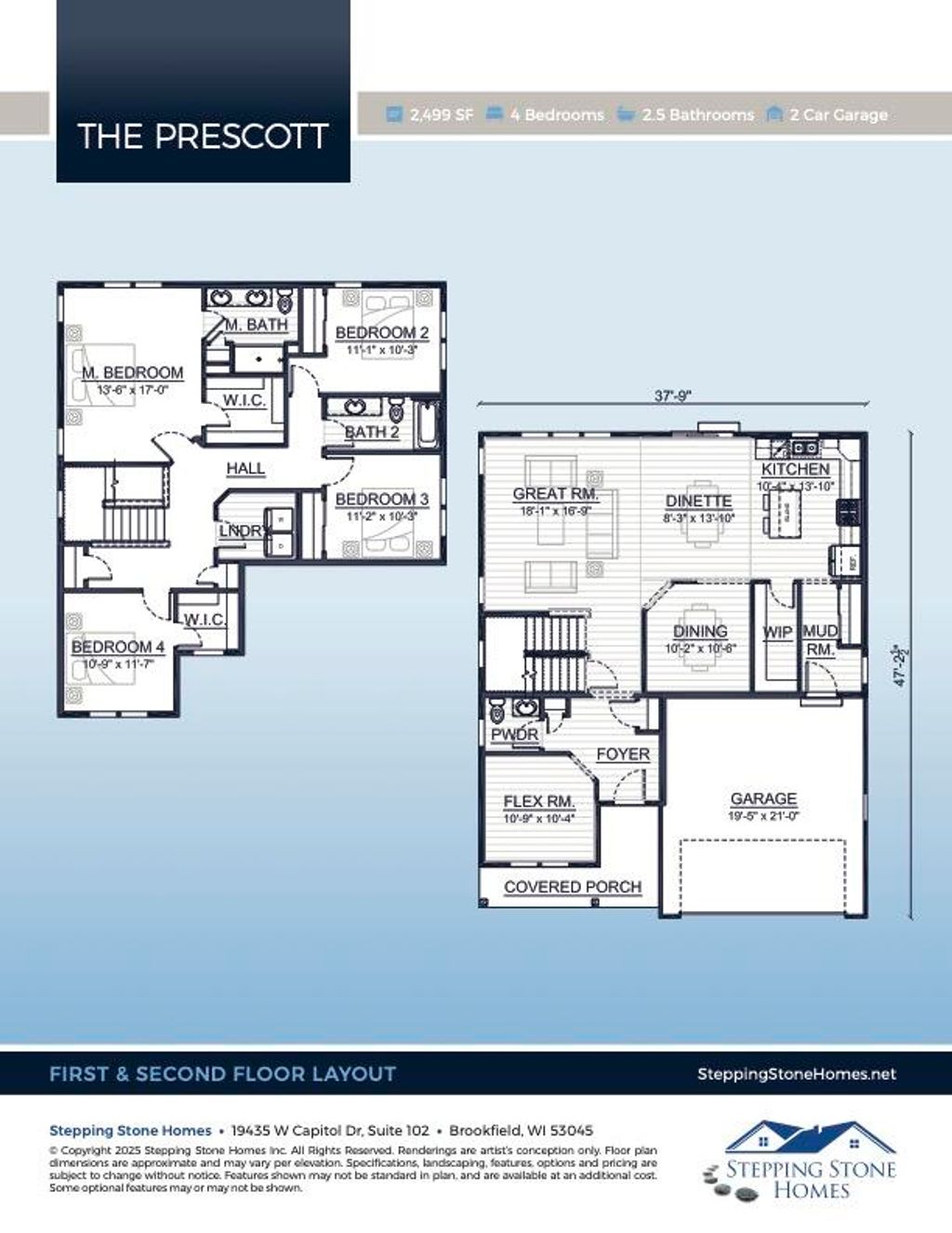 Nestled near WCGC hole #3 &4, The Prescott (lot 2) by Stepping Stone Homes is a thoughtfully designed two- The first floor includes a kitchen w/ walk-in pantry, dinette & dining area for additional seating, & a great room & a flex room, that's just perfect for a home office or playroom. Upstairs has 2 full bath, 4 bedrooms, including an Owner's Suite with a walk-in closet and private bath. A second-floor laundry rounds out the convenience of this spacious home. HOA docs and monthly dues to be uploaded soon. *Home floor plan layout is for reference only. Actual home dimensions may vary.