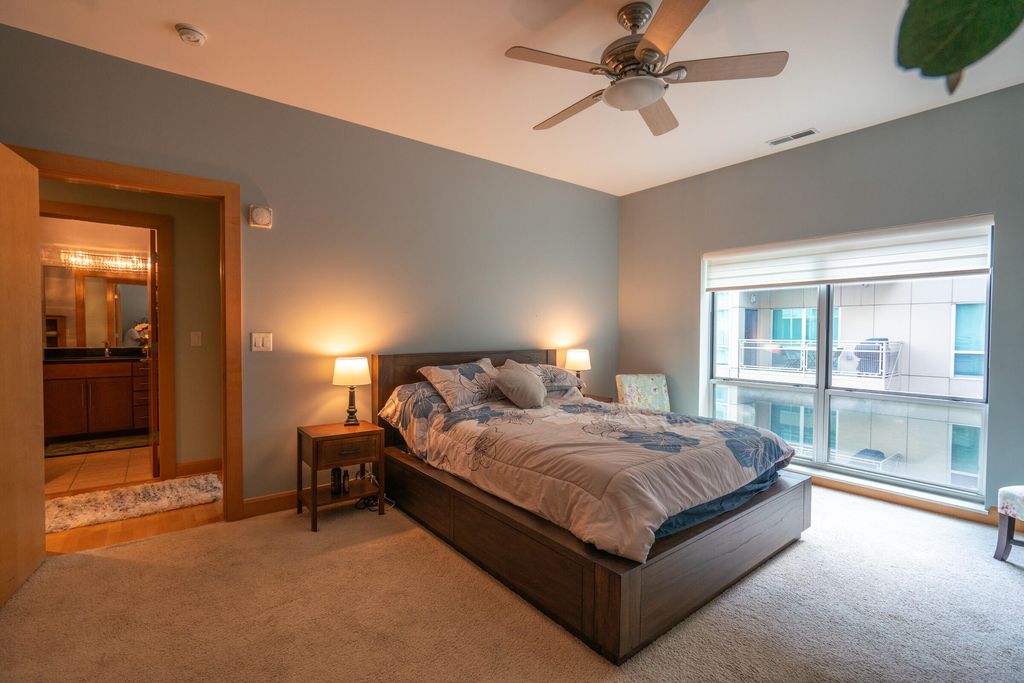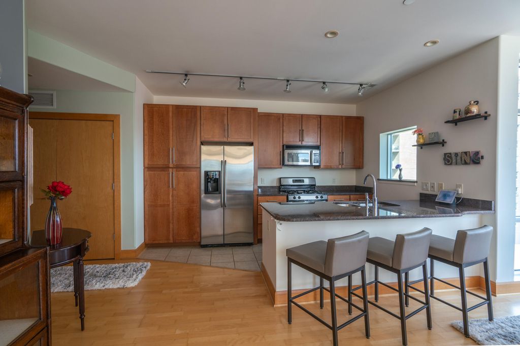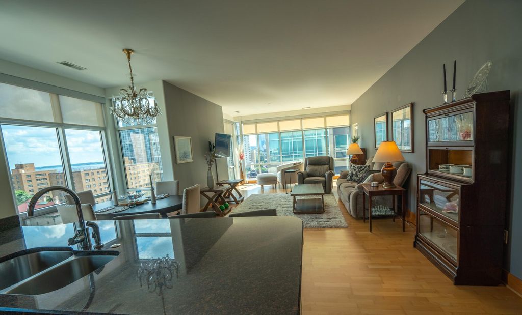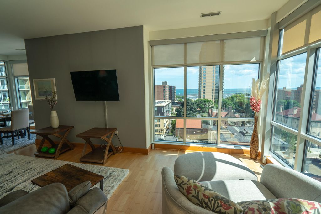Spectacular views from your spacious open concept 9th floor home at The Sterling in Milwaukee's East Side neighborhood. Corner unit w/floor to ceiling windows provide views of Lake Michigan and McKinley Marina. Kitchen w/ granite counters, stainless appliances &window. Dedicated dining space and breakfast bar. Great room has hardwood floors, access to private balcony w/ gas grill to enjoy the cool lake breezes & views. Owners BR has ensuite w/ tub, separate shower & walk-in closet. Guest room/office & 2nd full bath. In unit laundry. Lots of in unit storage and storage locker on 9th floor. The Sterling boasts well equipped fitness center& community room w/kitchen, television& pool table. Underground 2 parking spots on 2nd level and bike storage!