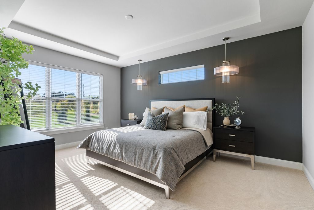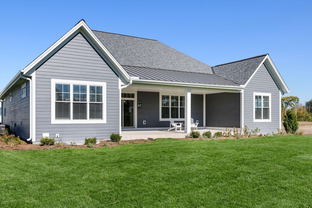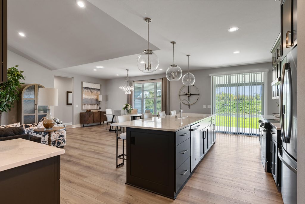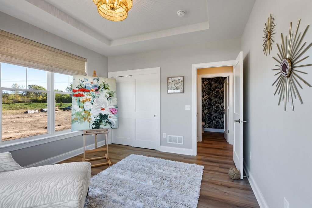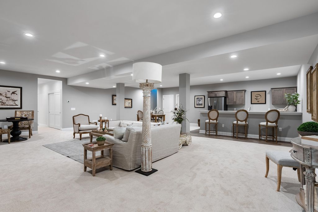 The Connelly delivers exceptional design throughout. A vaulted Great Room features a striking floor‑to‑ceiling stone fireplace, while the open‑concept Kitchen offers maple cabinetry, a quartz island and backsplash, and a walk‑in pantry overlooking the large, covered patio. The bright En Suite includes dual quartz vanities, a tiled shower, and two walk‑in closets. A split layout serves Bedrooms 2 and 3, and the 4th Bedroom on main floor adds flexible office or bedroom space. The finished lower level expands living with a kitchenette/bar, large Rec Room, exercise room, and additional bedroom and full bath. Enjoy the Clubhouse with fitness, golf simulator, pool, bocce, and pickleball. Low‑maintenance living awaits at The Grove in River Hills, just 15 minute