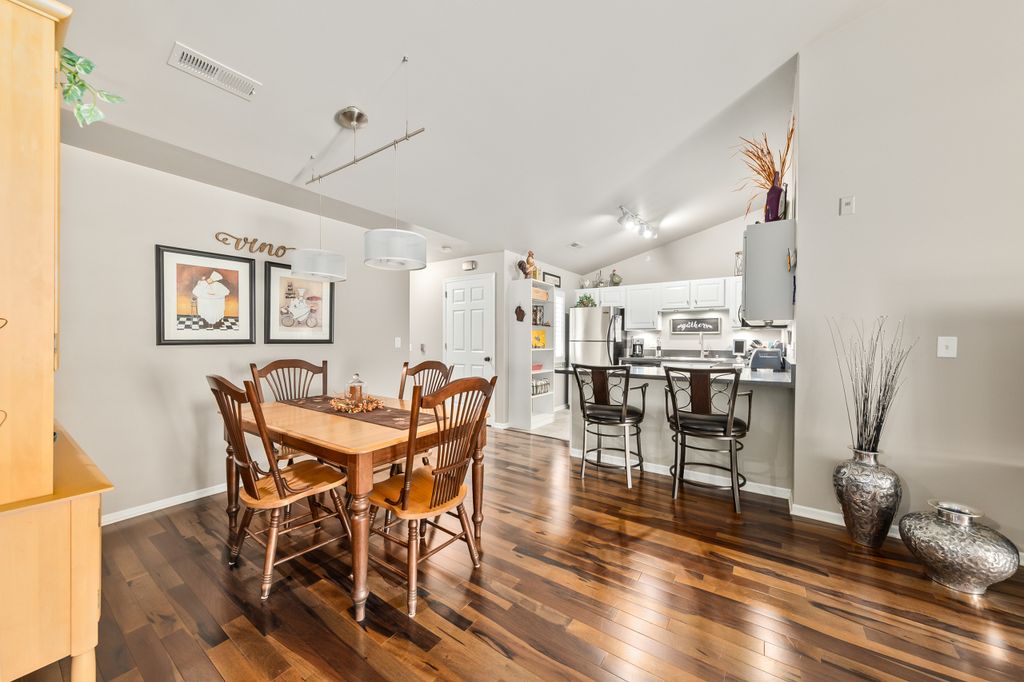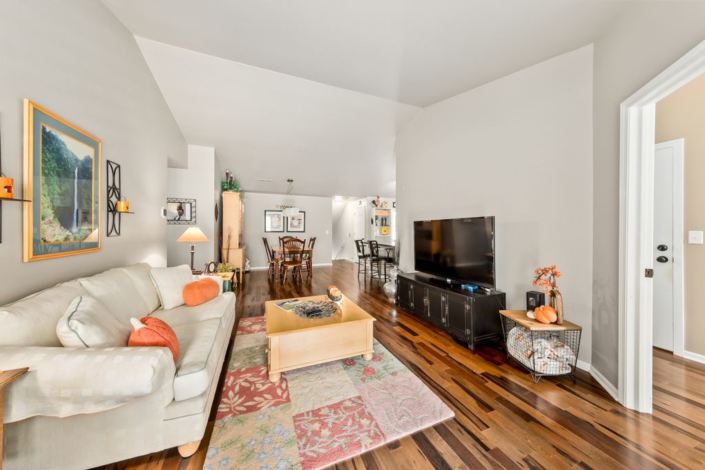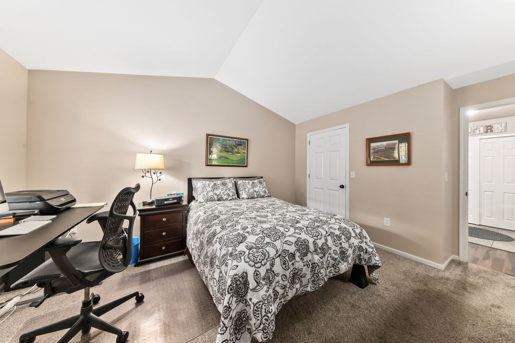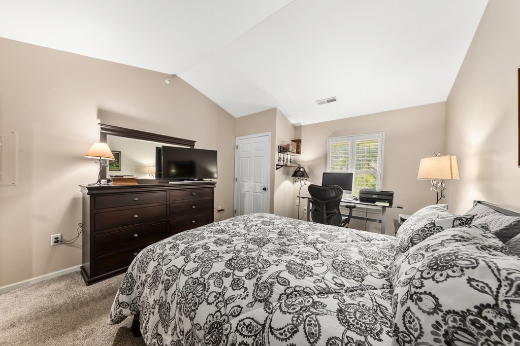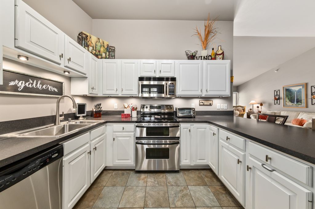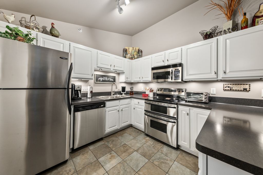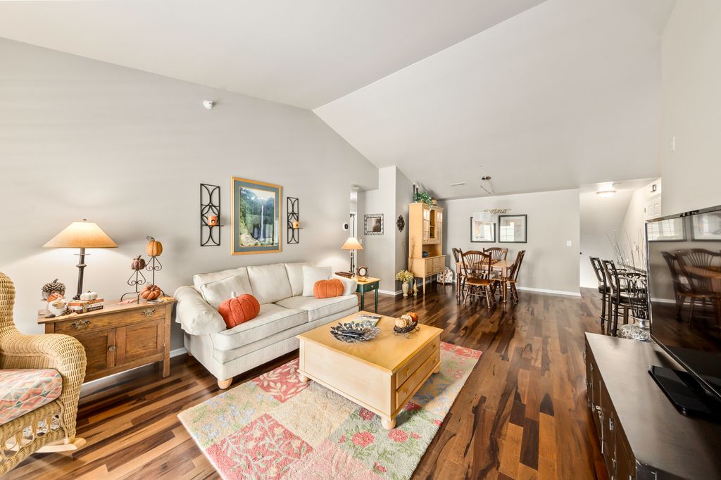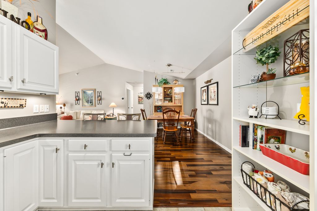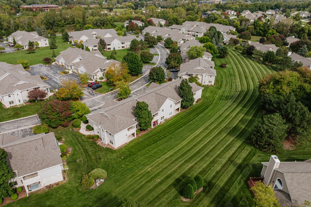 Certainly a cut above at Emerald Pointe! This is it! Absolutely prime south facing location in development w/ southern exp. abutting rolling green-space. Soaring vaulted ceilings, rich HWFs throughout main living area, white painted millwork throughout. Awesome KIT. w/upgraded raised panel cabs, SS appliances, & lots of counters. Custom walk-in pantry closet that rocks! Spacious primary ensuite w/ c.tile floor & newly updated walk-in shower. Massive walk-in closet. Step saving full size W/D incl. Covered patio, one car private garage. The best Brookfield location near The Corners, Bluemound & I-94. BUY THIS ONE! Note: No special assessment due for asphalt paving work in either phase.