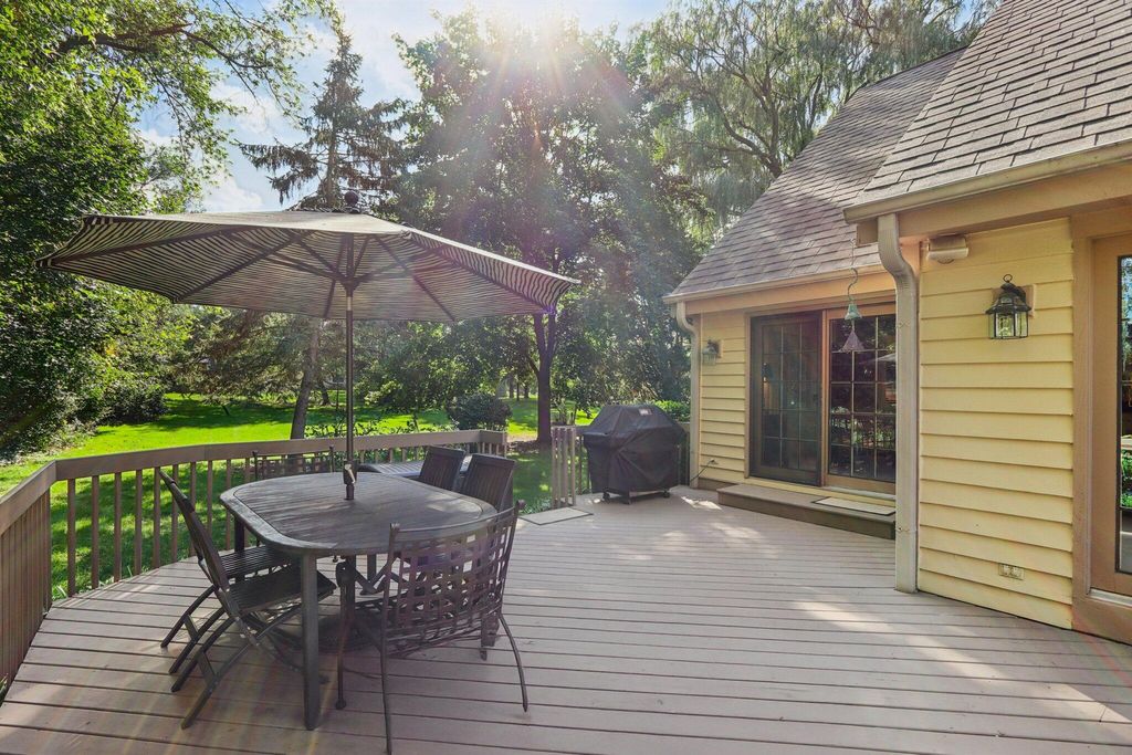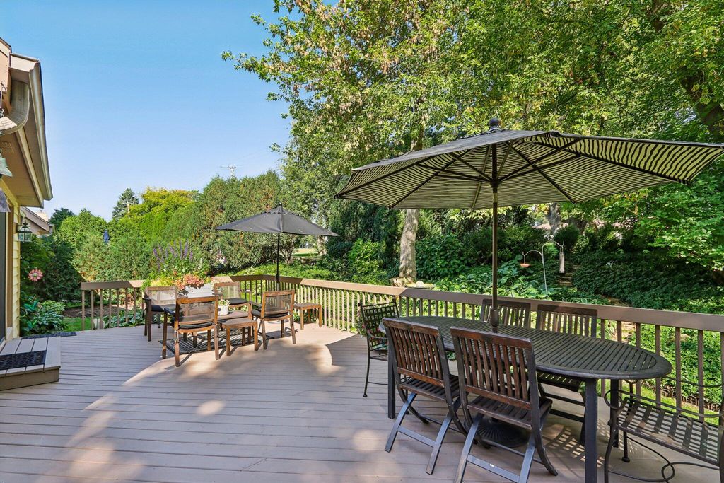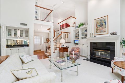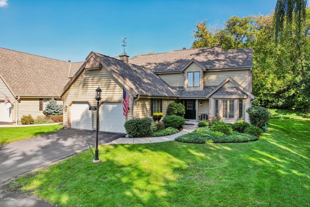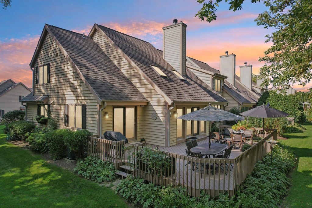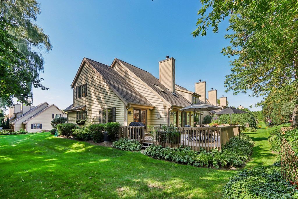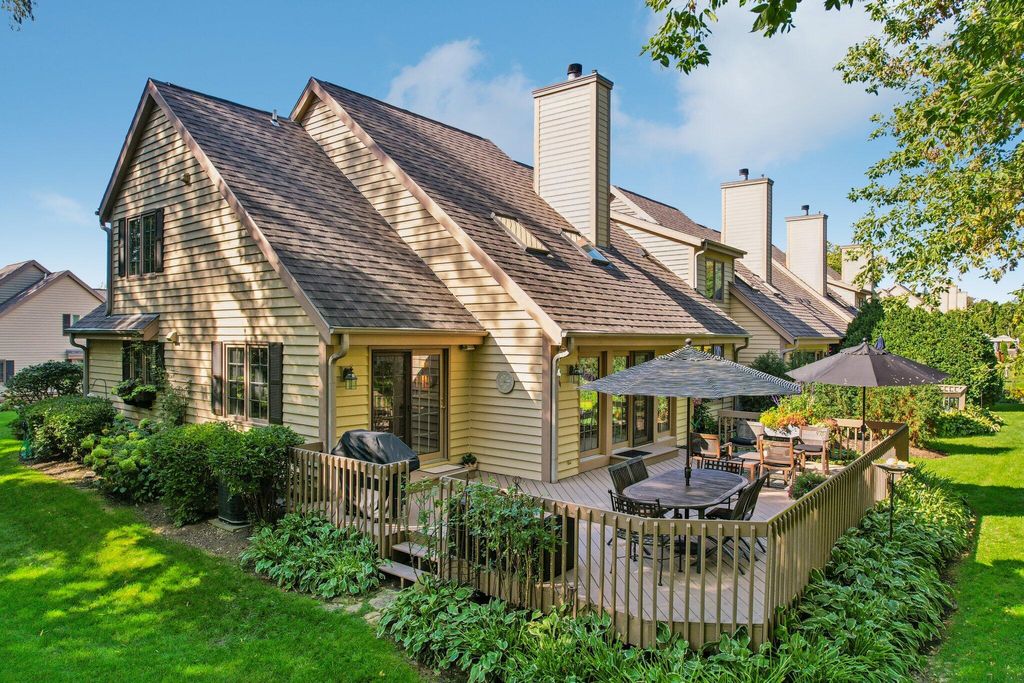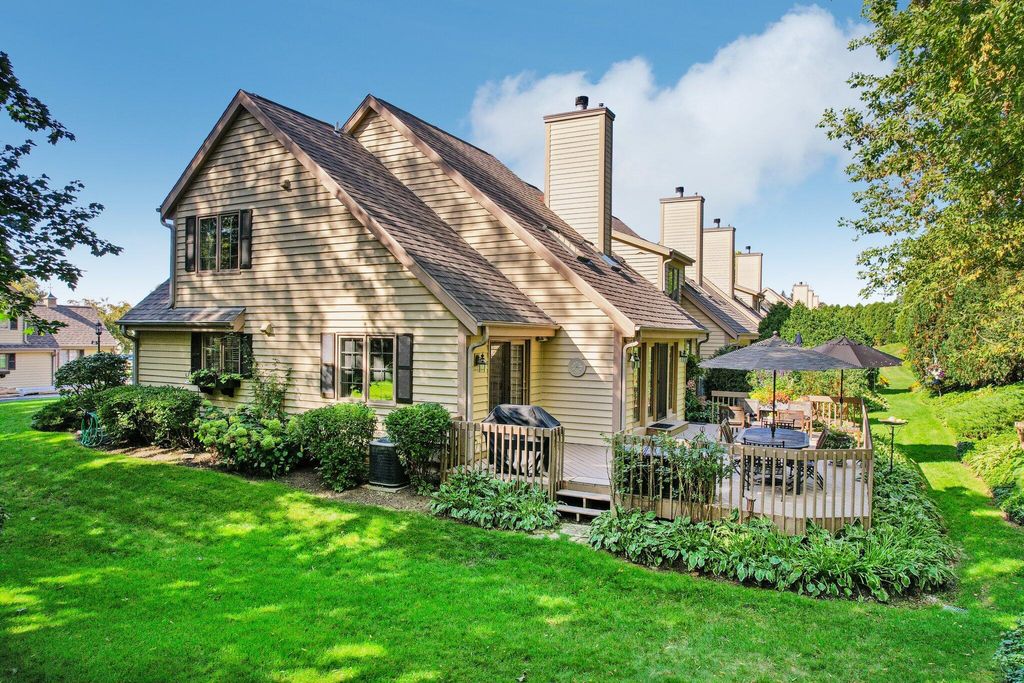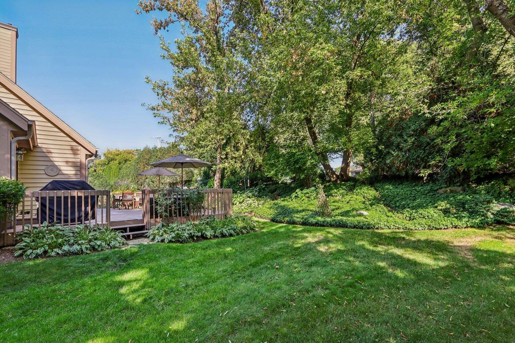Prime condo location tucked at the back of the association on a quiet cul-de-sac, surrounded by gardens and green lawns. This traditional townhouse offers sunny east and south exposures that fill every room with light. Enjoy treetop and garden views from all windows and relax on the oversized newer deck overlooking private landscaping. A custom floor plan features a level living to dining room with built-ins, wet bar, gas fireplace, perfect for entertaining. The bright white kitchen has Corian counters, wood floors, and a dinette. Upstairs, a lofted library with pull-out couch adjoins the second bedroom and bath. Lower level provides ample storage and expansion potential. Stylish, comfortable, and quietly set in nature's beauty. Seller taking secondary offers.