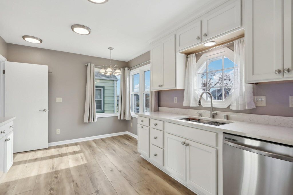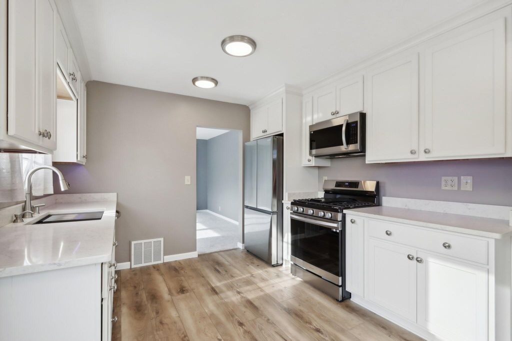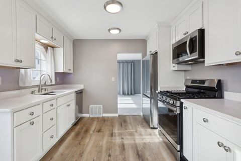 Pristine, updated, WOW! Completely new kitchen featuring white cabinetry, quartz counters, under cabinet lighting, stainless appliances, LVP flooring & a quaint octagon window. The spacious living room has new carpeting & an abundance of natural light. You'll love the freshly updated full bath on the main floor featuring new tile & a quartz top vanity. The 2 bedrooms are spacious & provide good closet space. The lower level is clean as a whistle featuring porcelain tile flooring throughout providing flexible space for whatever your needs may be. A full bath with shower also serves the lower level. The gorgeous backyard is completely fenced & offers mature trees, privacy & a large patio area. The oversized 1.5 car garage has dual doors to backyard & alley. Numerous updates throughout